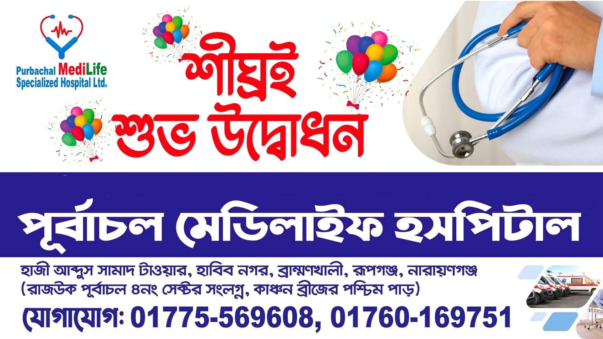 নারায়ণগঞ্জ পূর্বাচলে অবস্থিত পূর্বাচল মেডিলাইফ স্পেশালাইজড হাসপাতাল লিঃ আপনার সেবায় নিয়োজিত। দেশের সরকারী ও বেসরকারী হাসপাতাল-এর স্বনামধন্য ডাক্তারগণ নিয়মিত পূর্বাচল মেডিলাইফ স্পেশালাইজড হাসপাতাল লিঃ এ চিকিৎসা সেবা দিয়ে আসছেন।
